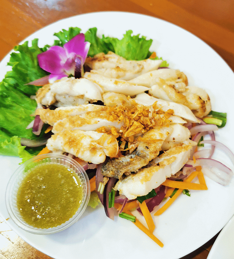 | corn and mango salad with crispy fish (anchovies) @฿89 |